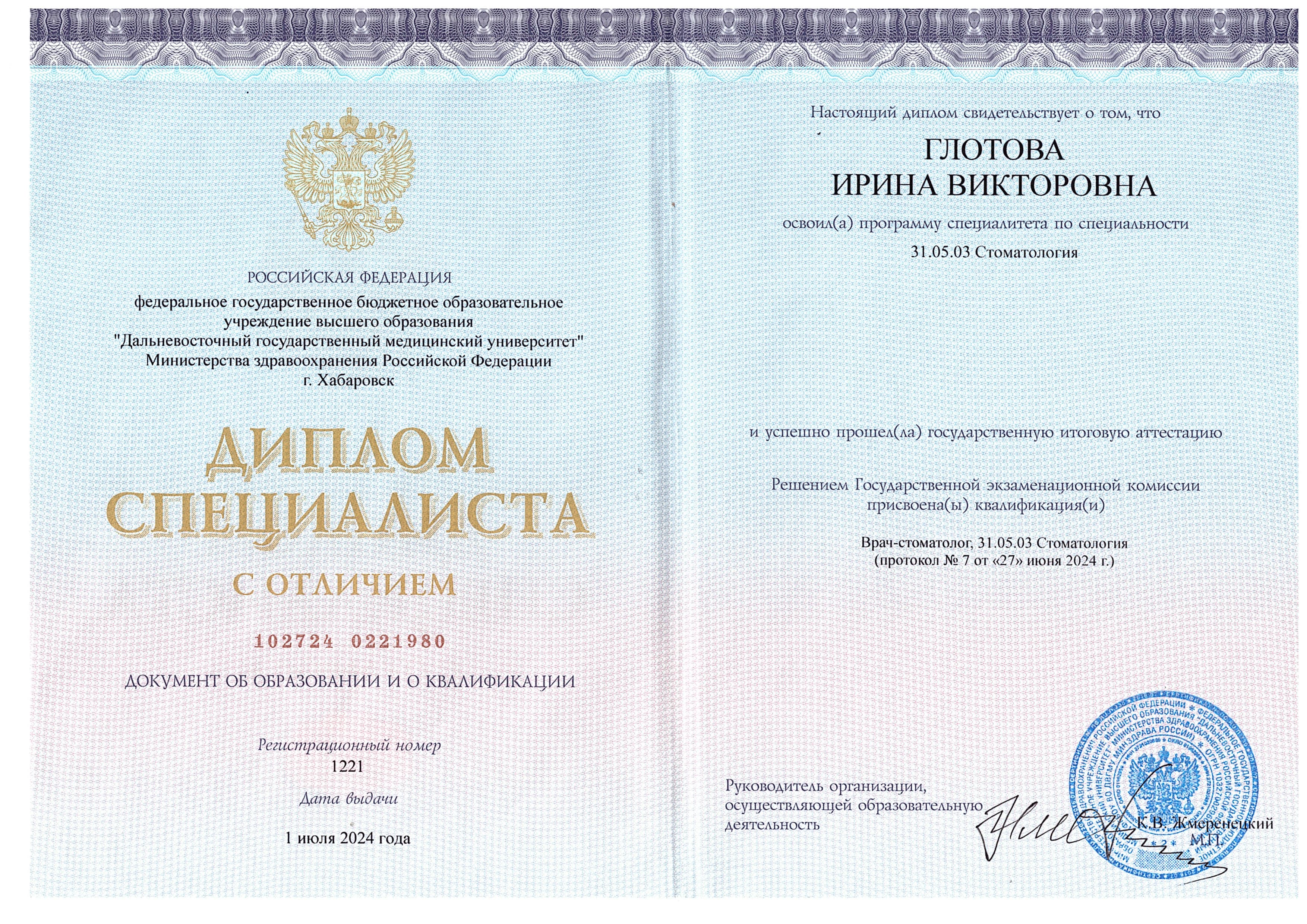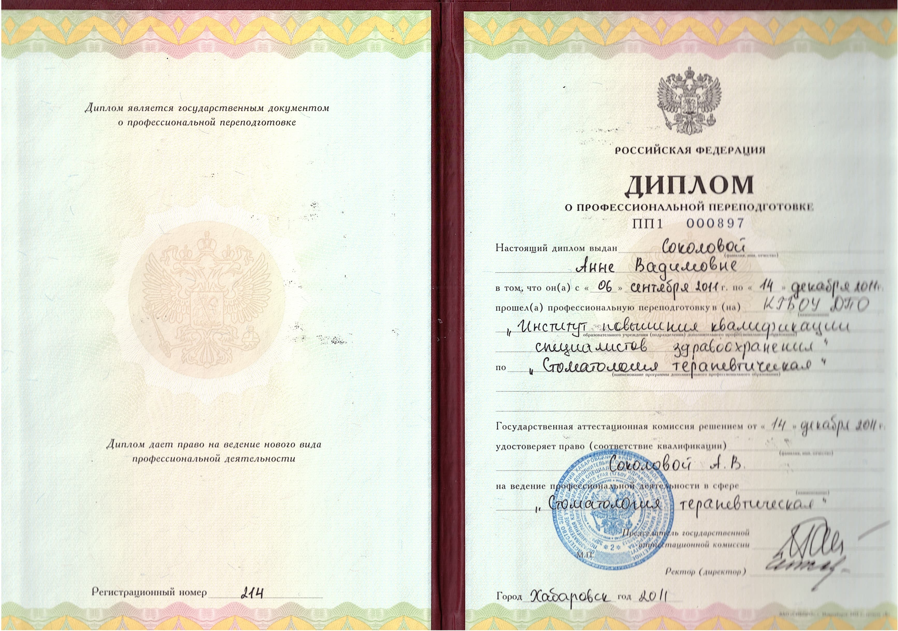 - ДВГМУ, специализация "Стоматология", 2013 г.