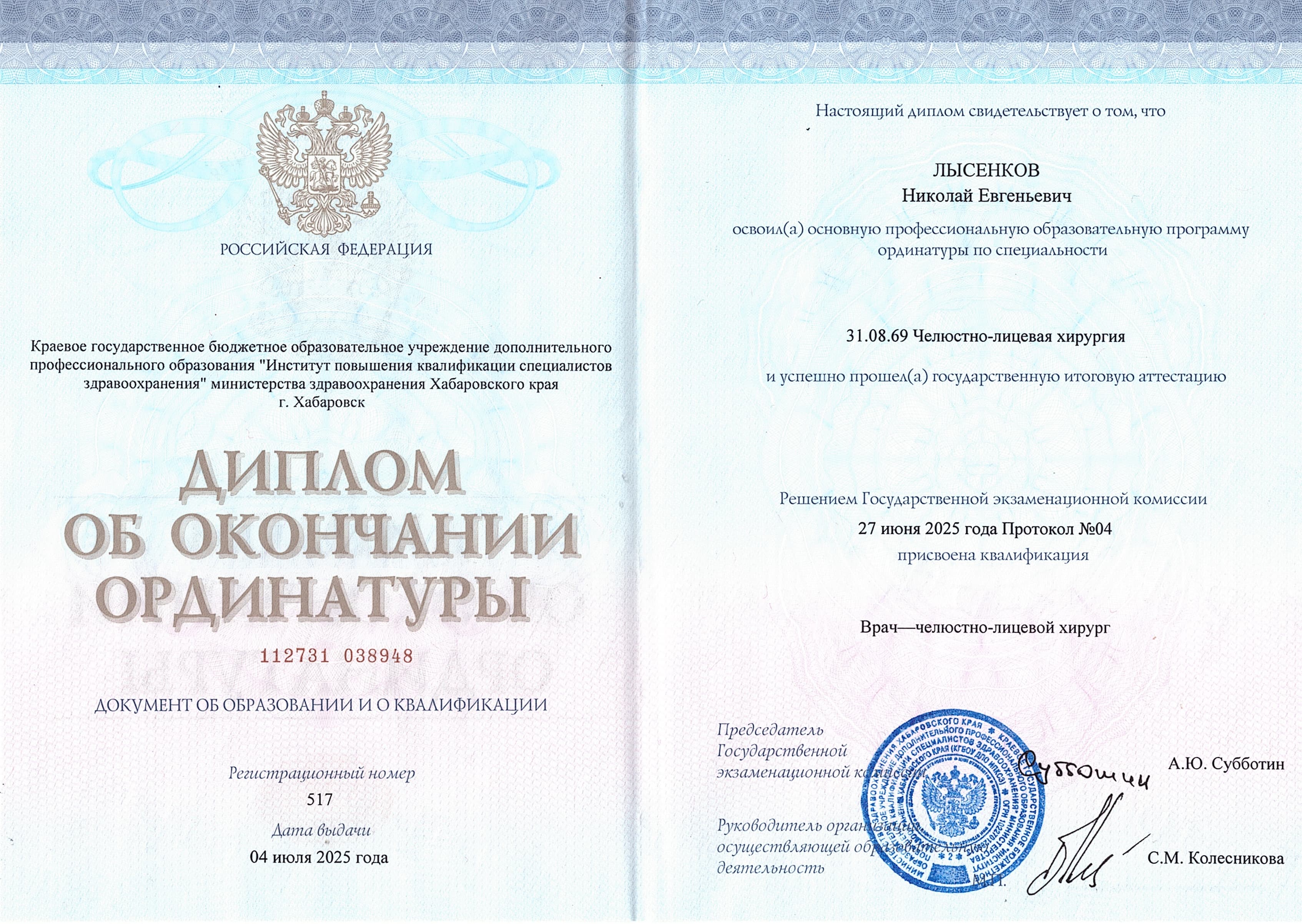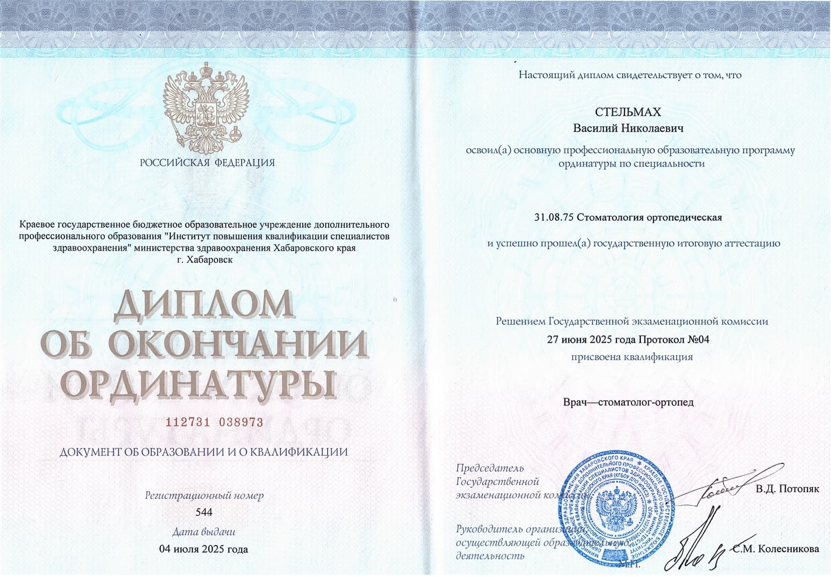 - КГБУ ДПО «Институт повышения квалификации специалистов здравоохранения» Минздрава Хабаровского края, ординатура по специальности «Стоматология ортопедическая» с присвоением квалификации «врач-стоматолог-ортопед», 2025 г.