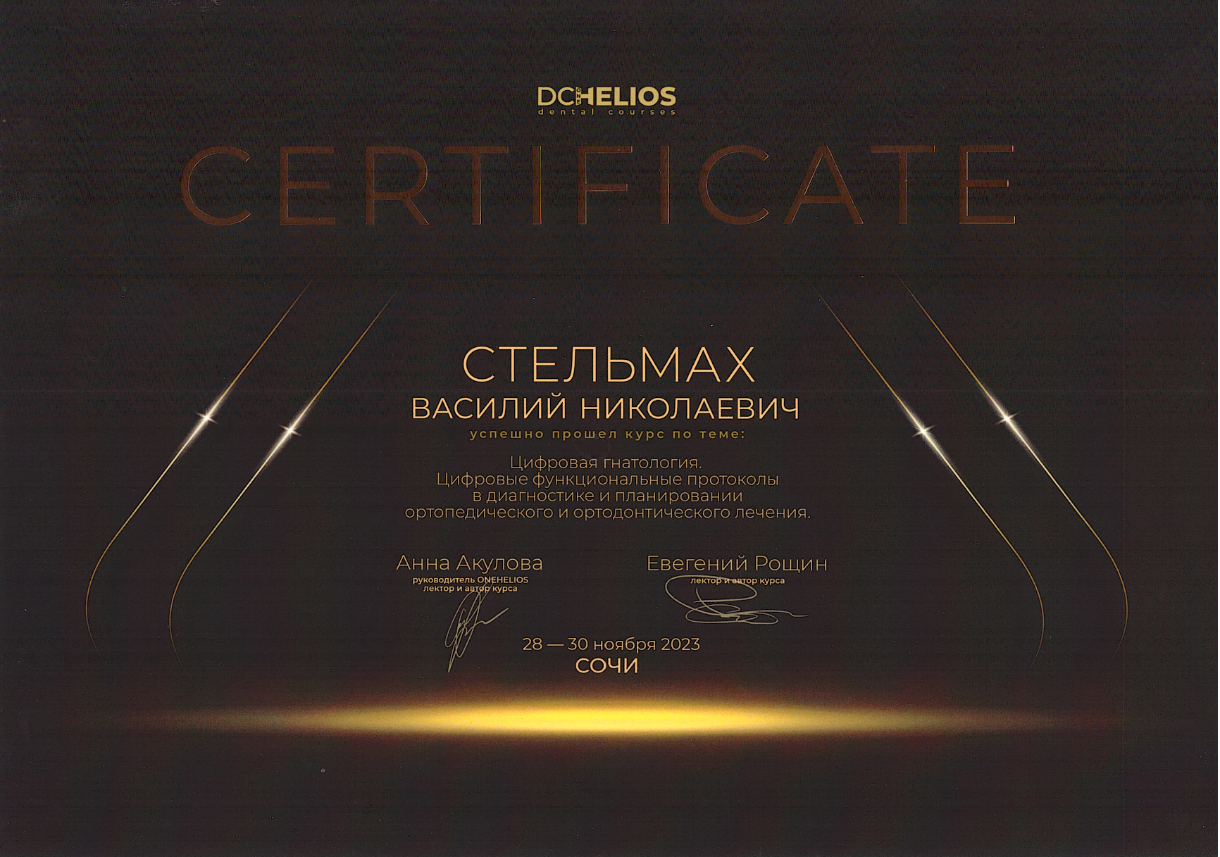 - Прошёл первичную аккредитацию специалиста по специальности «Стоматология» (врач-стоматолог) — 2023 г., ДВГМУ, действительна до 13.07.2028.