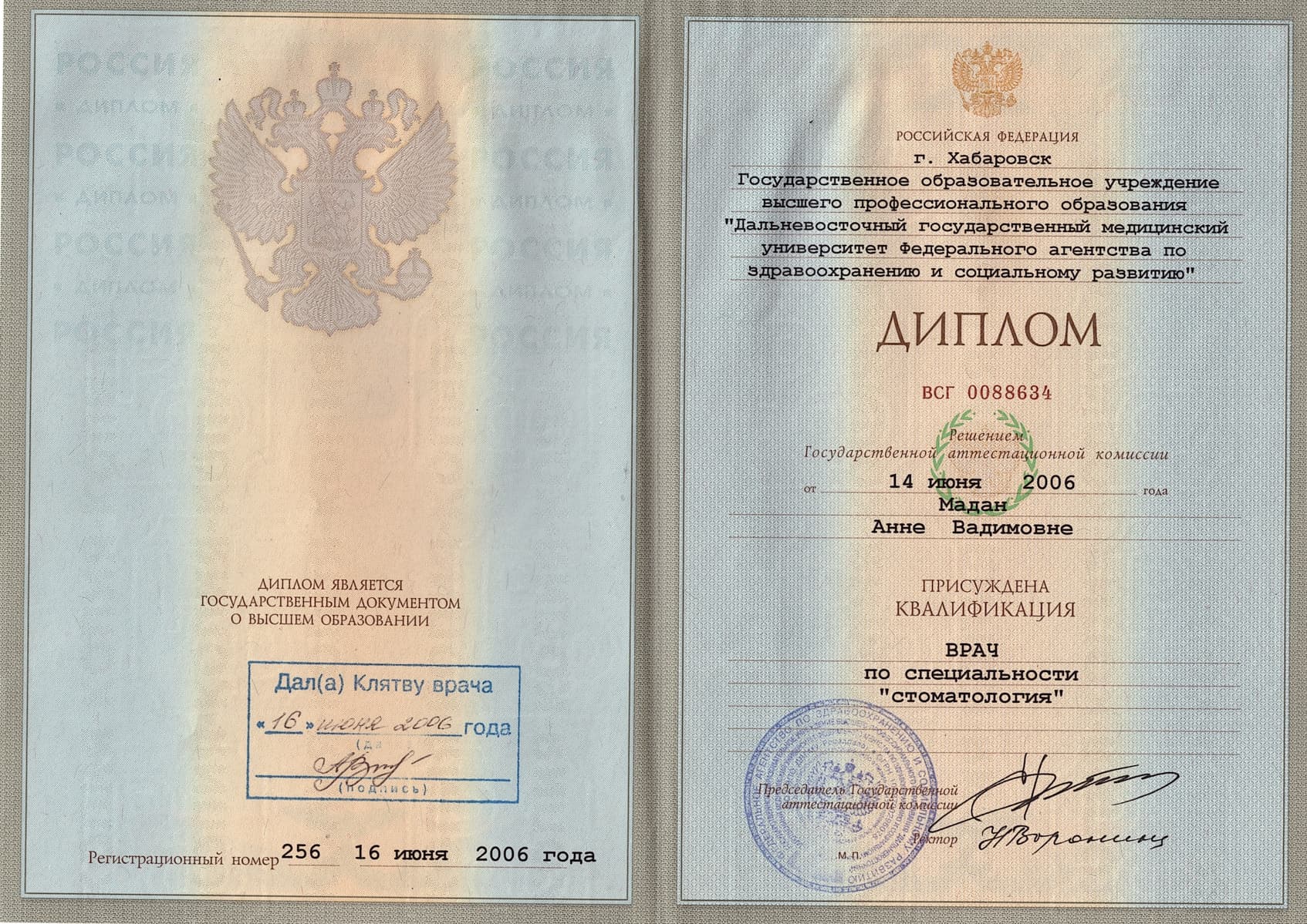 14.06.2006 Врач по специальности «Стоматология»