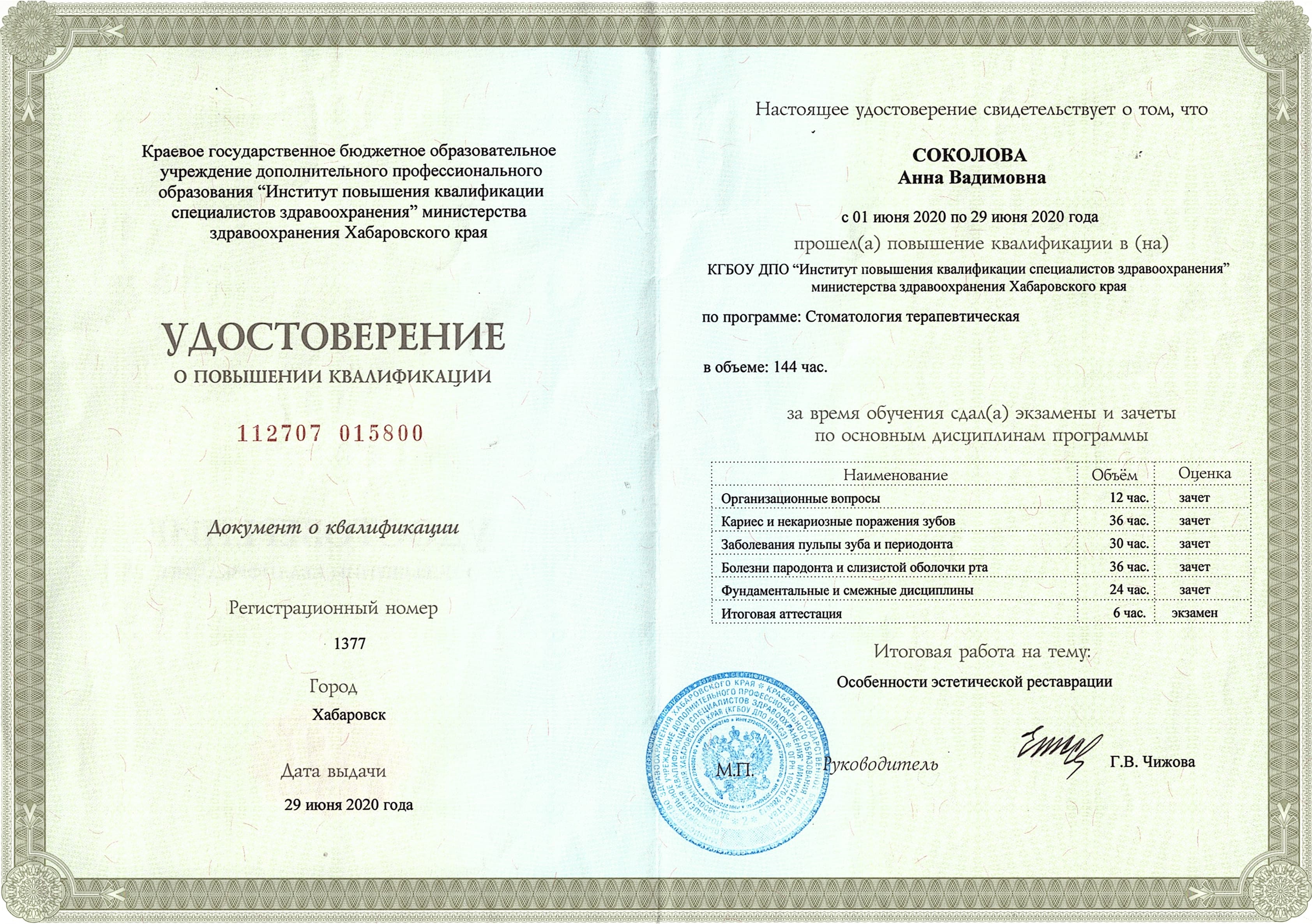 - Сертификат специалиста 0727310489493 г.Хабаровск 21.10.2020г «Стоматология терапевтическая»